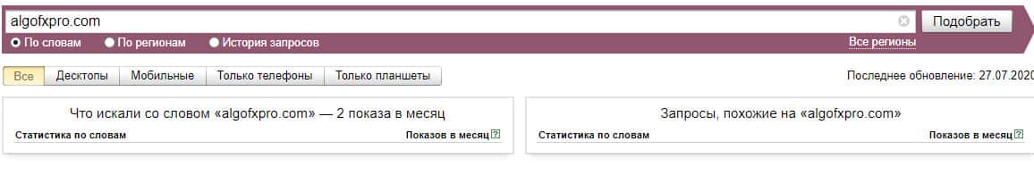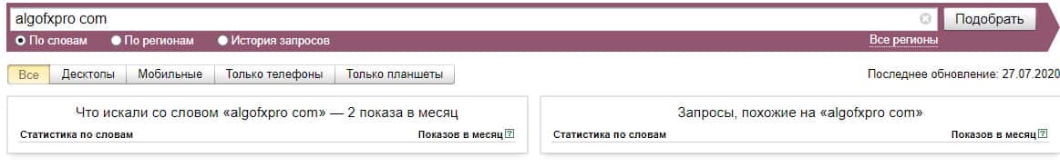 Если взять и пробить в Яндекс.Вордстат чисто домен сайта без точки "algofxpro com", то система выдает нам 2 показа в месяц.