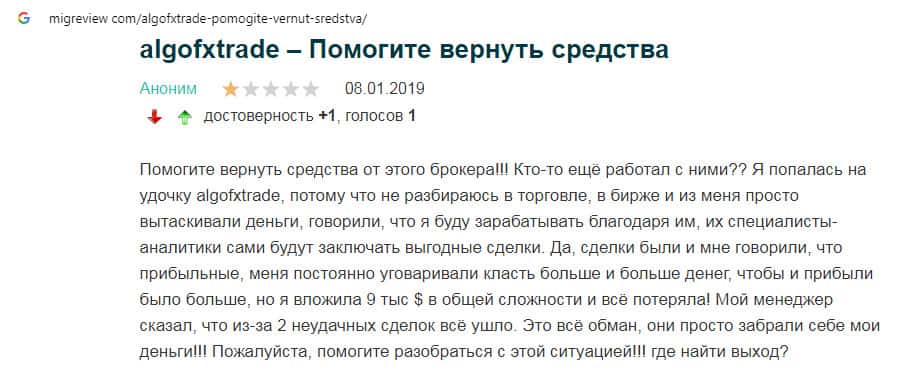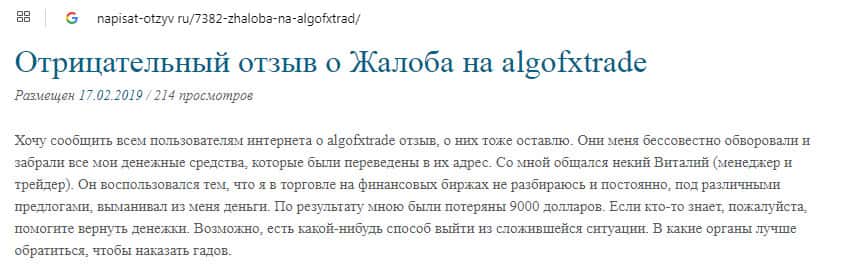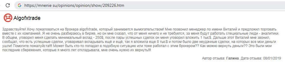 - Отзыв некой Галины о мошенничестве компании Алго ФХ Трейд найден на веб-сайте mnenie su