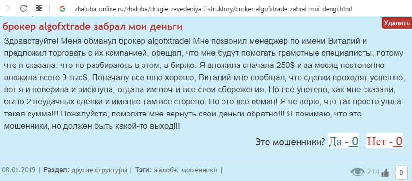 - Жалоба на скам-брокера AlgoFX Trade найдена на веб-сайте zhaloba-online ru