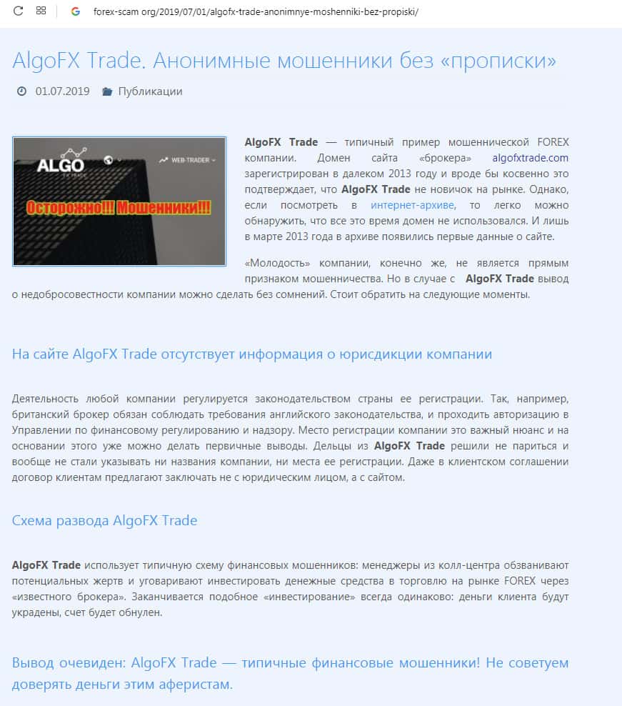 - Статья-разоблачение о скам-конторе Алго ФХ Трейд найдена на информационном сайте forex-scam org