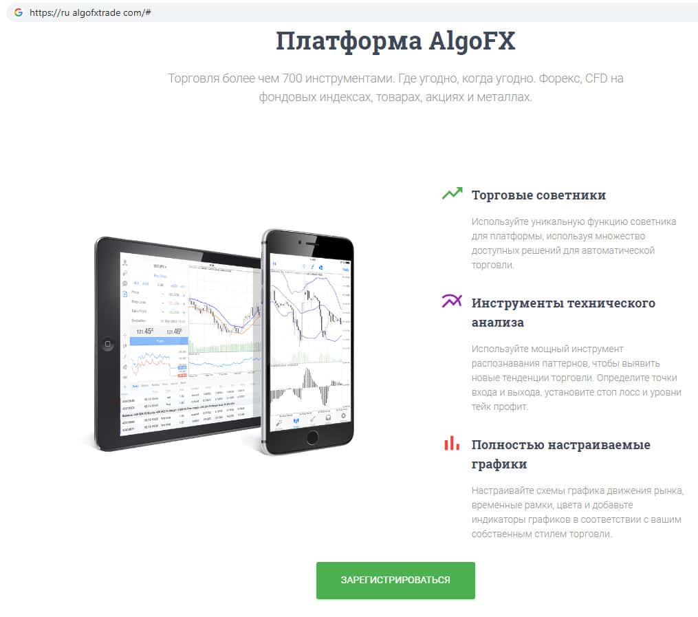 Контора Алго ФХ Трейд предоставляет на своем сайте платформу с множеством торговых инструментов. Чтобы посмотреть на данную платформу необходимо зарегистрироваться, что категорически делать нельзя, потому что после регистрации Вам начнут названивать представители компании Алго ФХ Трейд.