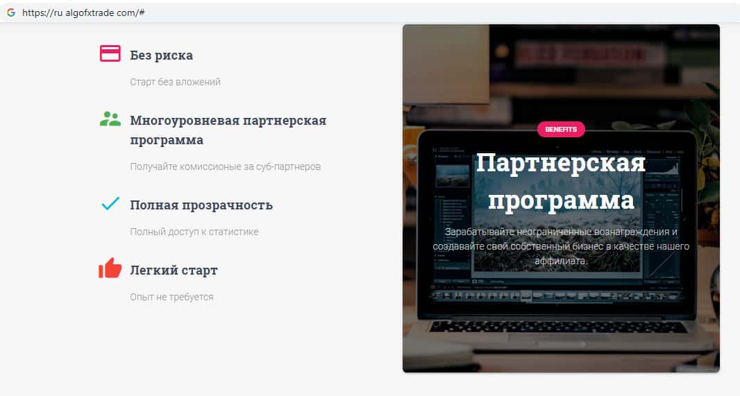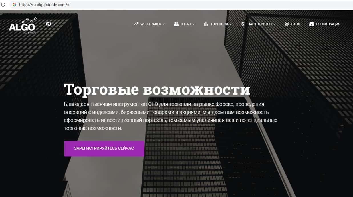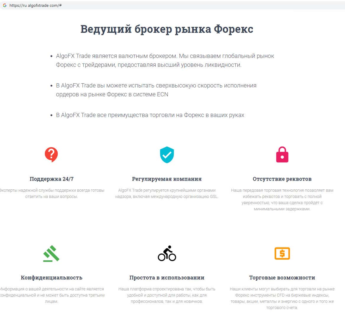 Алго ФХ Трейд на своем официальном сайте предоставляет себя как ведущего брокера на рынке форекс. Представители скам-организации Алго ФХ Трейд делают акцент на торговые возможности компании, а так же якобы предоставляемую конфиденциальность. Не стоит верить в пустые обещания компании Алго ФХ Трейд.