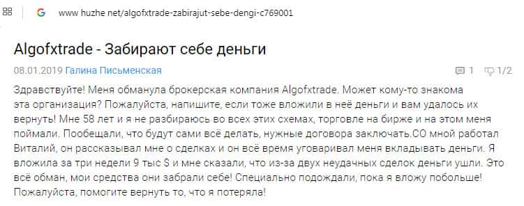 - Комментарий некой Галины об аферистах Алго ФХ Трейд на информационном сайте huzhe net