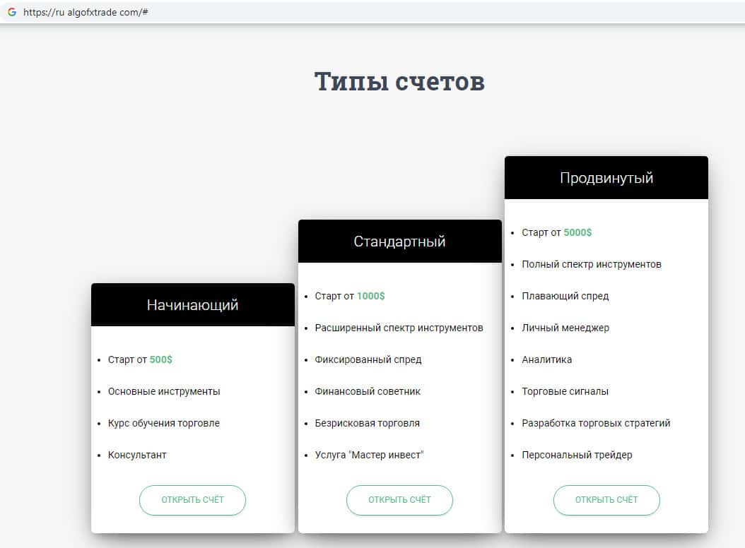 Типы торговых счетов скам-конторы AlgoFX Trade