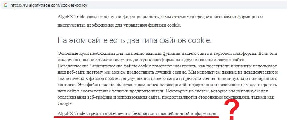 Политика конфиденциальности аферистов компании AlgoFX Trade