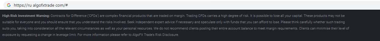 Представители скам-организации Алго ФХ Трейд указывают большим шрифтом о торговле без вложений и без риска потери средств, а мелким шрифтом незаметно на английском языке указывают о том, что торговля на рынке форекс имеет высокий уровень риска потери средств. Тем самым жулики Алго ФХ Трейд снимают с себя какую-либо ответственность.