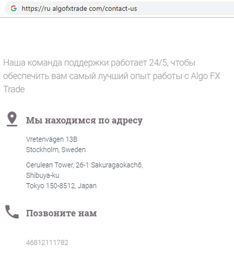 На официальном сайте компании Алго ФХ Трейд указано 2 адреса по которым якобы находятся главные офисы организации, один из них зарегистрирован в Швеции, а второй в Японии. Так же жулики конторы Алго ФХ Трейд указывают свой номер контактного телефона, позвонив на который готовьтесь к навязчивым звонкам: