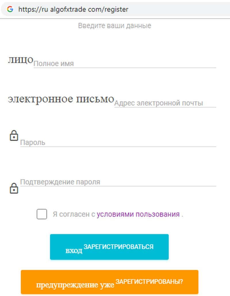 Скам-контора Алго ФХ Трейд ведет сбор данных о клиенте. Предлагая зарегистрироваться мошенники компании Алго ФХ Трейд предлагают заполнить анкету, в которой необходимо указать всего лишь свое имя и адрес электронной почты. А согласившись с суловиями на сайте Вы автоматически регистрируетесь на торговой платформе Алго ФХ Трейд.