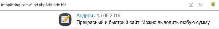 После первого вывода денежных средств, для продолжения выплат по инвестициям с пользователя с ником фунтик457 мошенники из АлиТрейд потребовали написать положительный отзыв о их конторе. Или положительный отзыв и деньги или ничего - так разводят клиентов в АлиТрейд.
