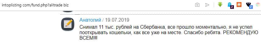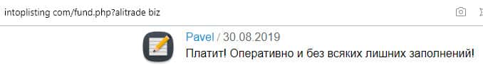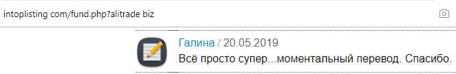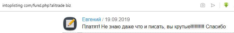 Портал intoplist com кишит положительными отзывами, восхваляющими аферистов в АлиТрейд. У пользователя Евгения отобрало дар речи от восторга и обожания конторы мошенников. Он называет эту мошенническую кухню крутыми, хотя что такого крутого в том, что шайка воров под предлогом инвестиций ворует у людей их честно заработанные деньги.