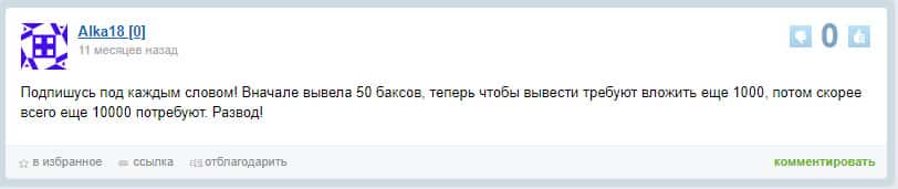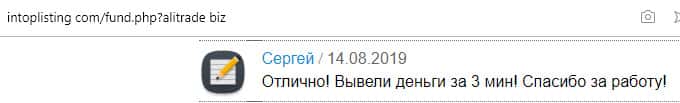 Ещё один глупец, который ради собственной выгоды, является носителем жестокого обмана. Это пользователь под ником Сергей. Он пишет об отличной работе этой мошеннической кухни, пишет, что вывели ему деньги за 3 минуты. Но почему-то постоянно в таких случаях молчат о всякого рода излишествах. Запомните, что Али Трейд - лохотрон.
