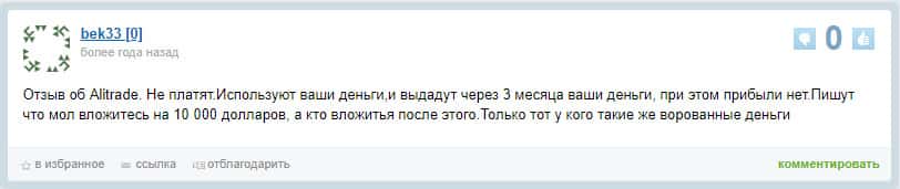 Для того, чтобы получать прибыль на проекте АлиТрейд клиенту предлагается внести более десяти тысяч долларов инвестиций. Тогда уж начнут выплачивать. Иначе будут только сами пользоваться инвестициями клиента. Такую историю рассказывает пользователь под именем bek33.