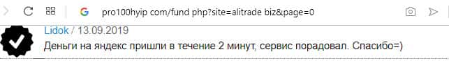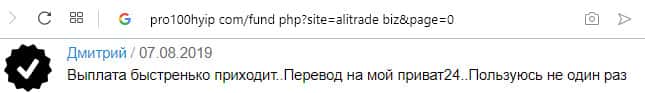 Ещё одна пачка проплаченных отзывов об АлиТрейд на портале pro100hyip