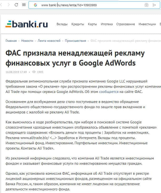 Портал Банки ру разместил информацию о предписании ФАС России компании Google LLC об устранении рекламы мошенников АлиТрейд и о возбуждении дела об административном правонарушении в отношении Google LLC для назначения штрафа, сумма которого может составить от 100 тыс. до 500 тыс. рублей всвязи с рекламой аферистов, не имеющих лицензии на осуществление деятельности инвестиционного фонда.