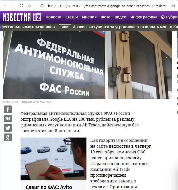 - "Известия" сообщают о штрафе Google за ненадлежащую рекламу финансовых услуг портала АлиТрейд