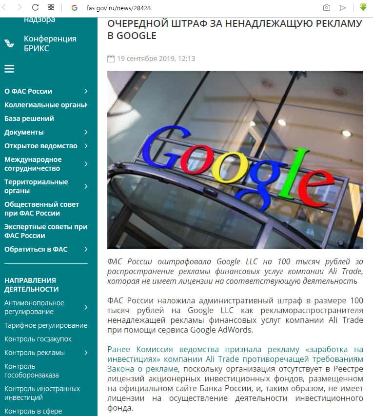 - Непосредственное заявление ФАС России о штрафе Google LCC за рекламу сервисов AliTrade