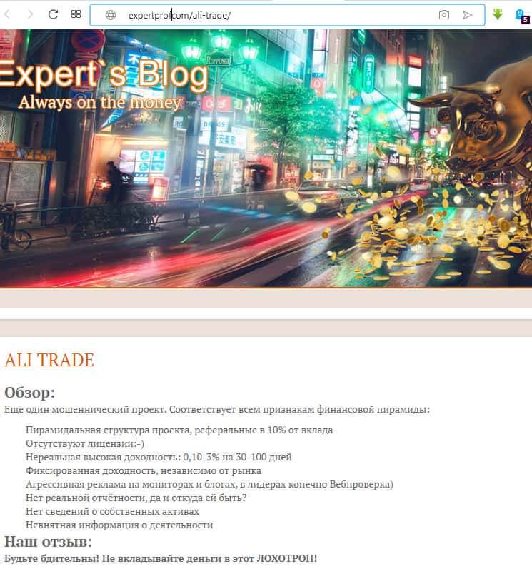 Мнение экспертов с expertprof com о проекте АлиТрейд однозначно - афера. Проект соответствует всем признакам финансовой пирамиды: пирамидальная структура проекта, реферальные в 10% от вклада, нереальная доходность: 0,10-3% на 30 дней, фиксированная доходность, независимо от рынка и прочее.
