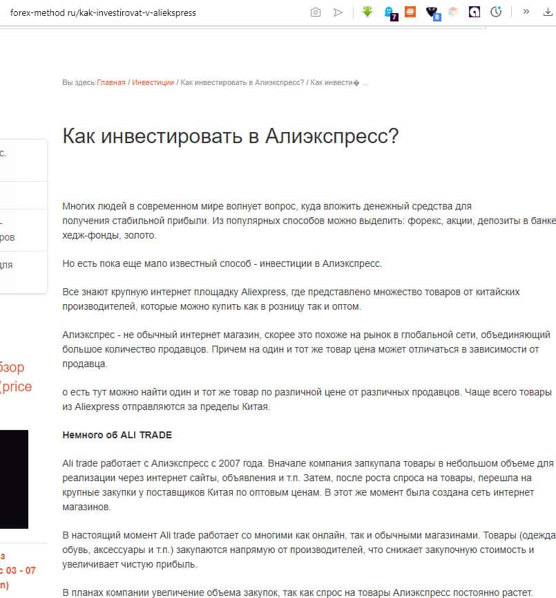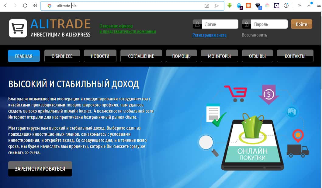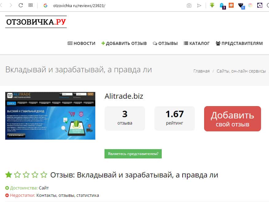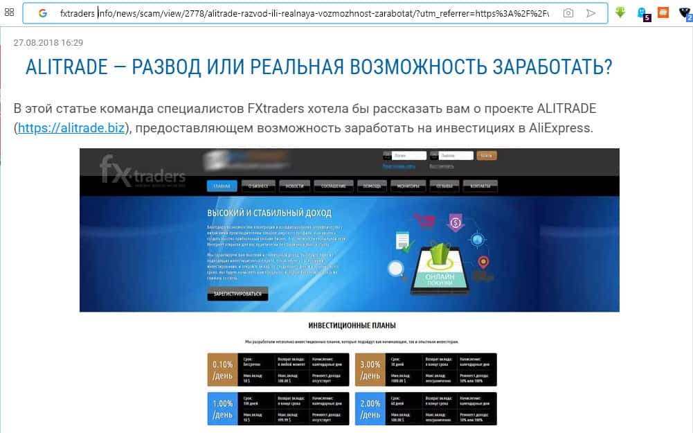 Ещё один агент мошенников сайт 22forex ru. Он достоинства инвестирования в бизнес на базе АлиЭспресс с помощью площадки АлиТрейд. В статье отмечается: высокая доходность (заявляемая АлиТрейд); надежность (что может быть надежнее финансовых пирамид, пока не развалились); перспективность (опять же принцип финансовой пирамиды - чем раньше, тем больше).
