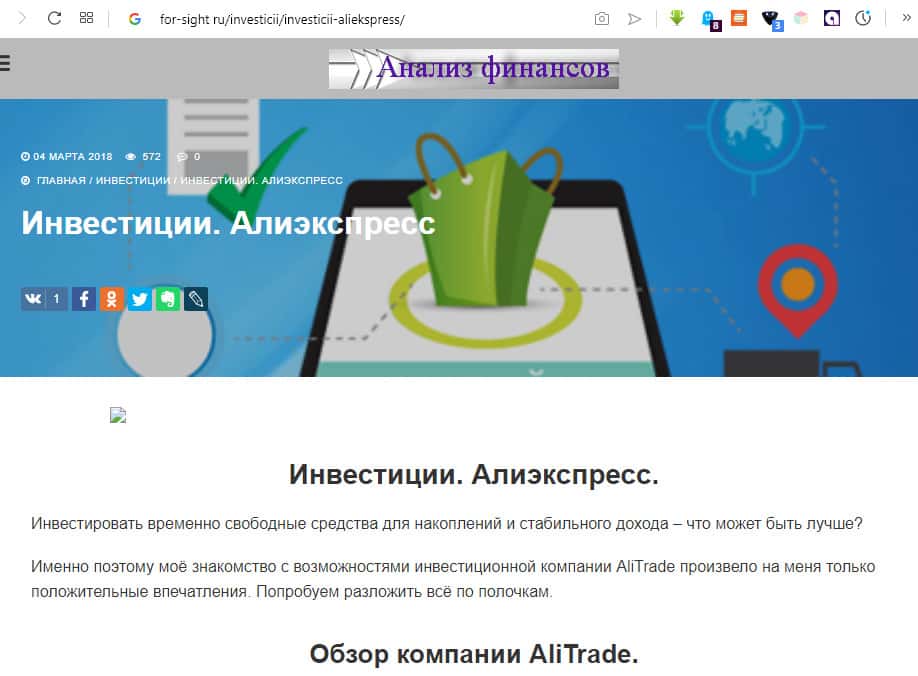 Рекламная статья, посвященная АлиТрейд размещена на портале for-sight ru. В ней идет речь о выгодах сотрудничества с АлиТрейд, способной предложить своим клиентам инвестиционные планы, приносящие сверхдоход. Правду говорят: "деньги не пахнут"! Администрация и этого сайта не устояла от взяток мошенников.