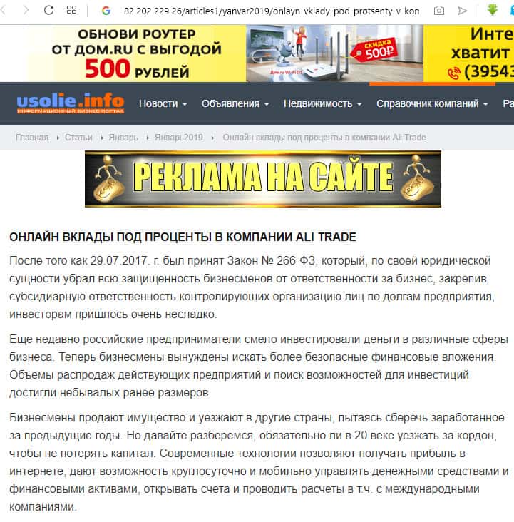 Разместил рекламную статью и сайт с IP-адресом 82 202 229 26. Описывая преимущества вложения денежных средств в проект компании АлиТрейд, авторы умышленно не говорят о рисках инвесторов, как и двадцать лет назад никто не предупреждал вкладчиков МММ.