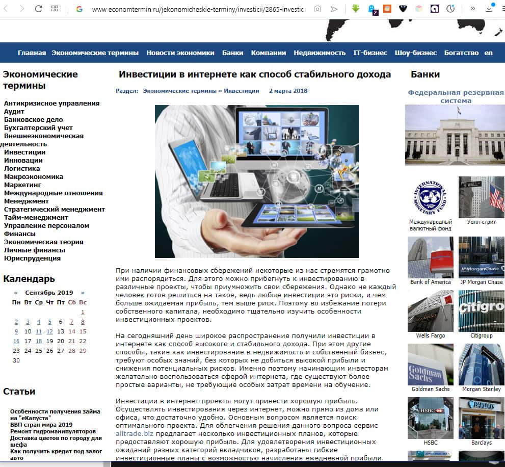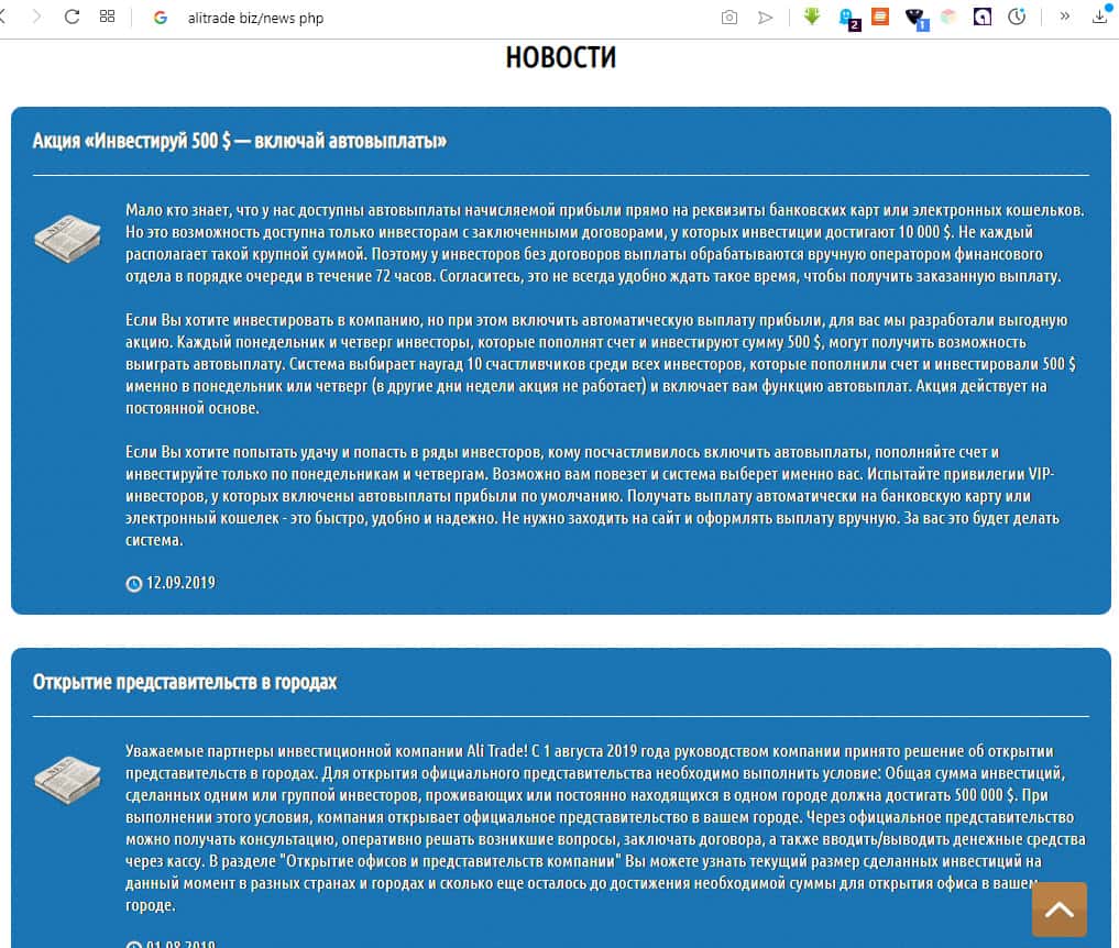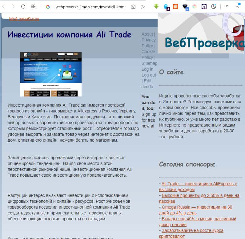 Ещё одна рекламирующая инвестирование в АлиТрейд статья располагается на портале вэбпроверка. Построение финансовых пирамид оказывается мировой тенденцией, а рост в будущем объемов инвестиций в компанию, и как следствие товарооборота, позволит инвестиционной компании Ali Trade создать доступные тарифные планы. Ложь и мошенничество!