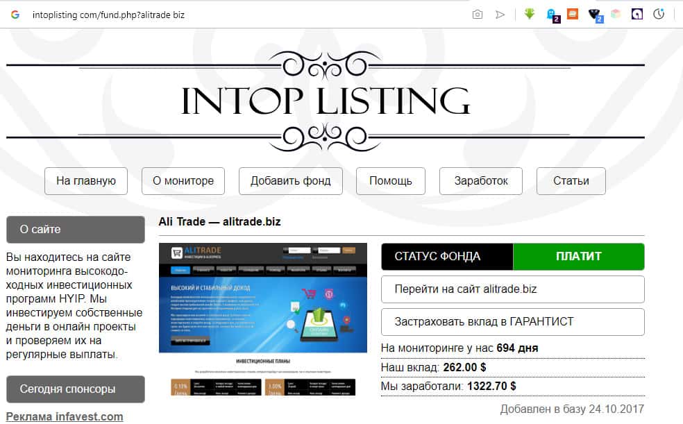 - Портал intoplisting com на "подкормке" у мошенников АлиТрейд