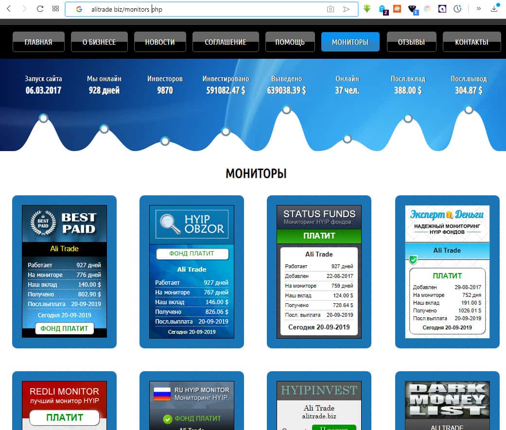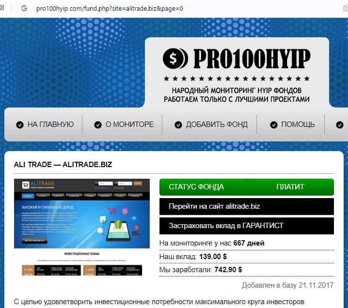 На порталах простохайп, uhyipmonitor, statusfunds, hyipobzor, woodlisting, dollarhyip, expertdengi, premiumlisting.biz, russian-investor.com, profitmonitor.biz, hyipinvest.biz, hyipexpert.biz, bestpaid.biz, darkmoneylist.com, bigcityfunds.com помещена полная копия рассмотренной ранее статьи на портале интоплистинг. Размещение одной и той же восторженной статьи о подобном проекте означает, не только продажность, но и низкие моральные качества администрации этих сайтов, сотрудничающих с мошенниками. На этих же сайтах, и только на них располагается куча восторженных и благодарных отзывов о АлиТрейд.