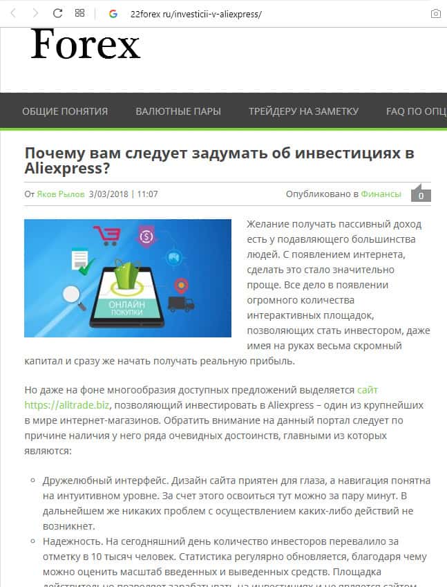 - Сайт 22forex ru поместил рекламу инвестирования в АлиТрейд