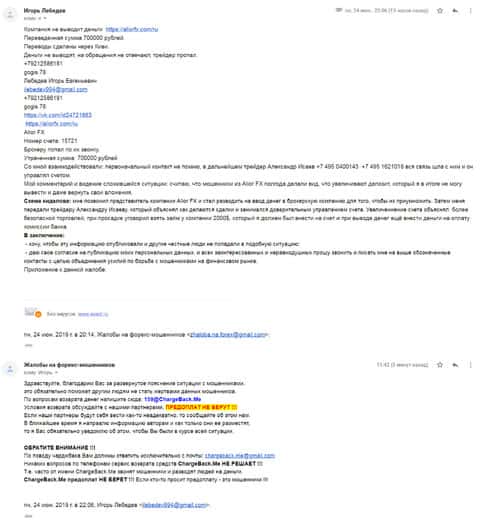 На публикации ниже предлагаем ознакомится с подробной жалобой на аферистов в лице брокерской кухни Алиор ФХ, которая обманула человека, опрокинув его на 700 000 рублей. По поводу возврата утраченных денег, человеку необходимо обращаться в специализированную службу ChargeBack.Me за помощью.