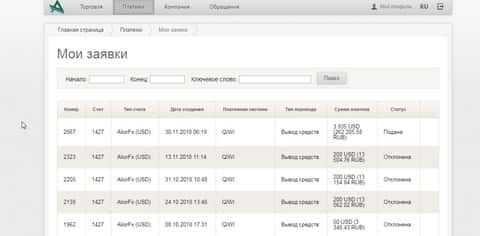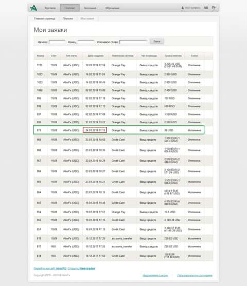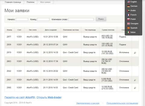 Ниже мы можем увидеть скриншот, который показывает, что клиент дилинговой кухни Алиор ФХ пытался вывести несколько разных сумм со своего счета, но все безрезультатно.