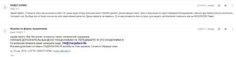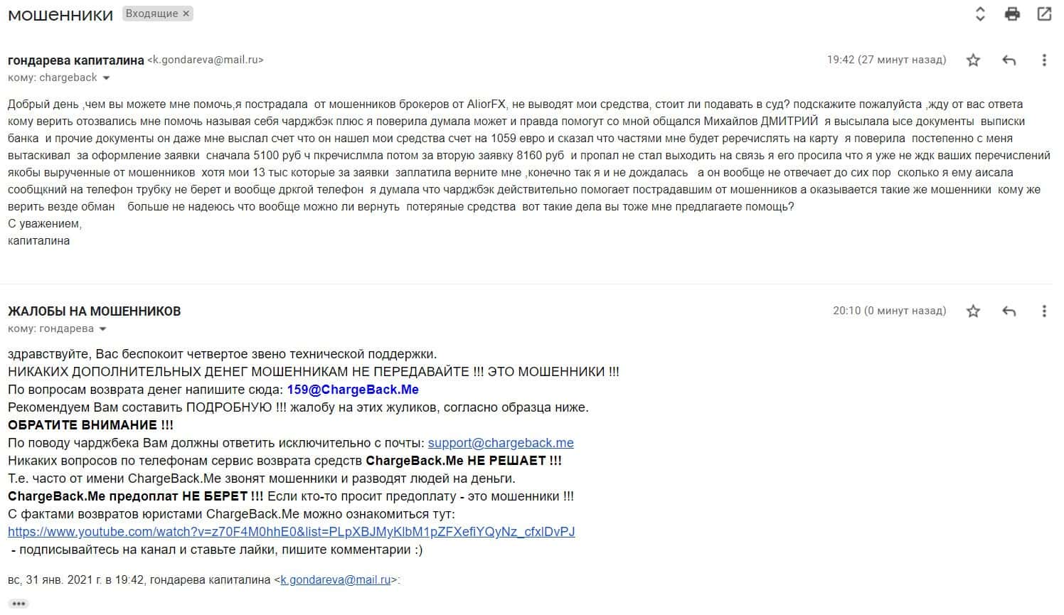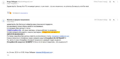 Автор последующей жалобы на аферистов в лице кухни Форекс Алиор Фх не указывает конкретной суммы, которую он утратил в данной жульнической организации, а лишь сообщает о том, что нуждается в помощи по возврату потерянных средств. И для этого, ему советуют обращаться в ChargeBack.Me