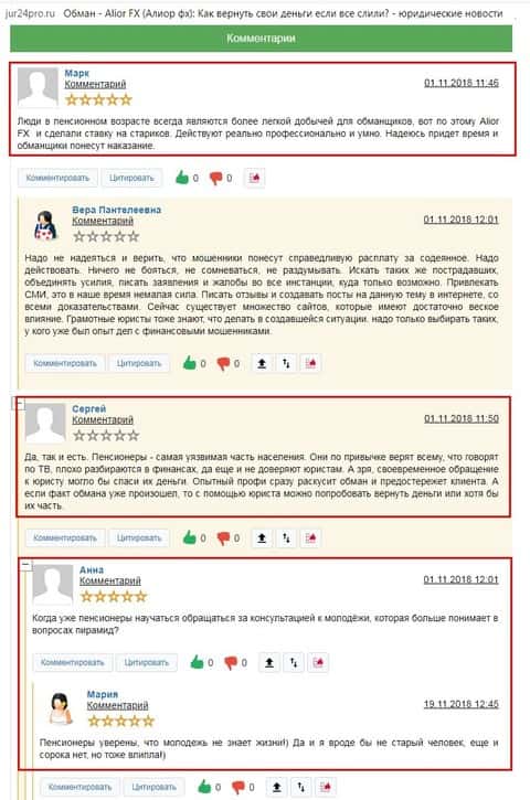 Со все большей популяризацией технологий, определённый пласт населёния находится во всё большей и большей опасности перед жуликами Алиор ФХ и им подобными. Как вы могли догадаться, речь идёт о пенсионерах. Именно, беря в расчёт отзывы под той же статьёй на сайте jur24pro ru, пенсионеры подверглись массированной атаке именно шарашкиной конторы Alior FX, которая нащупала слабость в бедных русских пенсионерах, и людях среднего возраста, которых, пользуясь их неопытностью в данной области, мошенники разводят десятками, оставляя доверчивых клиентов ни с чем.