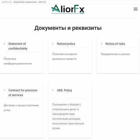 В разделе документации у мошеннической конторы Алиор ФХ не значится ничего, хоть отдалённо напоминающего лицензию. Таким образом, это является первой и самой главной причиной того, что Alior FX – мошенническая организация. Она ни коим образом не зарегистрирована, и никоим образом не реальна, что бы вам там не втирали её пылкие звонари. Права на законную деятельность контора Алиор ФХ не имеет, так как лицензия или любая другая реальная документация данной конторы отсутствует!