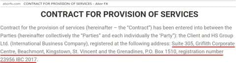 В том же Договоре, в самом начале, можно найти то, что "палит" всю контору Alior FX еще раз. Адрес, Suite 305, Griflith Corporate Centre, Beachmont, Kingstown, St. Vincent and the Grenadines, P.O. Box 1510. Мало того, что на этом адресе, если пробить в Гугле, не находится ничего похожего на Алиор ФХ. Данный адрес использовался мошенниками уже не единожды. Своего рода, шаблонный адрес в оффшоре на Карибах. Так и регистрационный номер, найденный тут же – липа. Таким образом, никаких реальных данных о контактах либо руководстве мошеннической конторы Алиор ФХ просто нет.