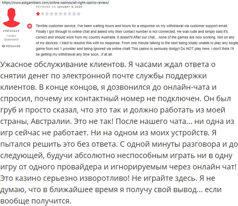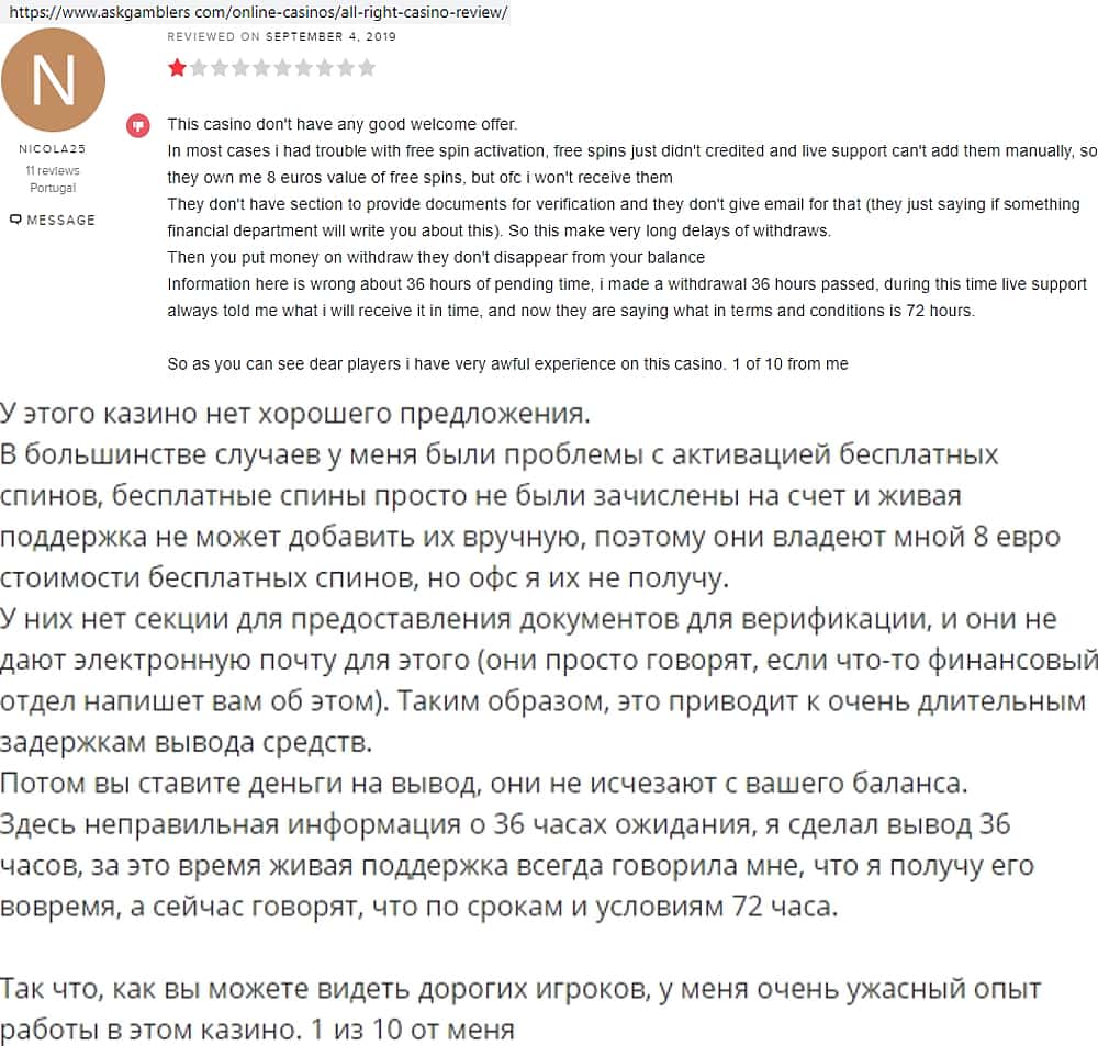 - Жулье All-Right-Casino не выполняют своих обещаний
