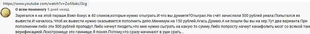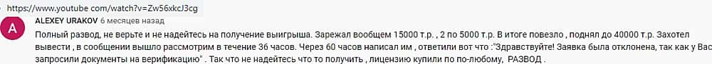 В официальной группе шулеров All-Right-Casino на канале ютуб ком, появилась жалоба. Видимо каталы All-Right-Casino еще не среагировали и не успели удалить. Один из игроков сделал крупный депозит, который увеличил удачной игрой более чем в 2 раза. Но на эти деньги у авантюристов видимо свои планы и они решили их не выплачивать.