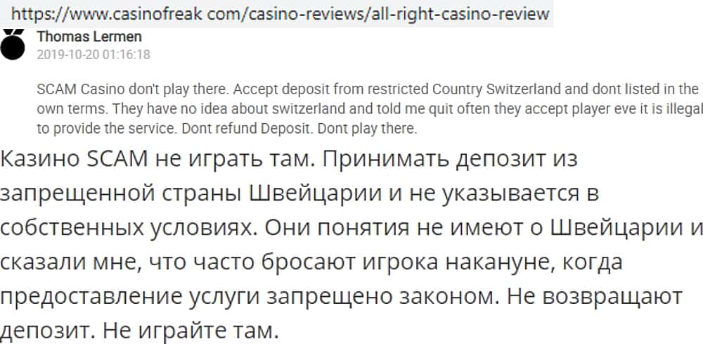 По словам очередного юзера, попавшего на удочку кидал All-Right-Casino, негодяи обещали бездепозитный бонус. Как только он зарегистрировался и предоставил им все данные, жулье All-Right-Casino дали заднюю и сказали, что никакого бонуса нет и нужно играть за свои деньги, которые естественно аферюги успешно уведут у игрока.