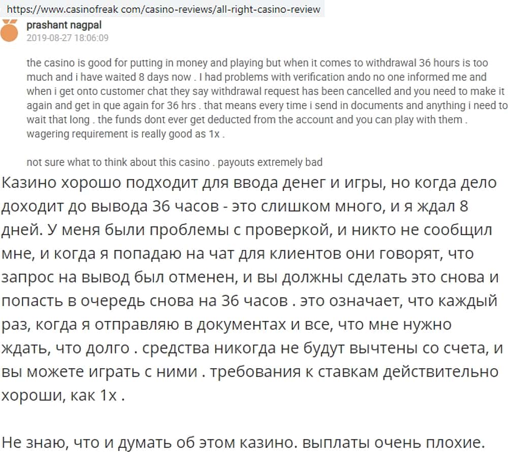 - Жулики All-Right-Casino всеми способами затягивают с возвратом средств своим игрокам