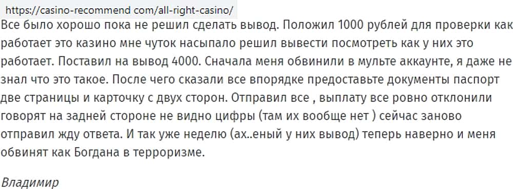 По словам одного из обитателей портала casino-recommend com, авантюристы Алл Райт Казино чтобы не отдавать игрокам деньги начинают юлить. При попытке вывести выигрыш в размере 4000 рублей, мошенническое казино Алл Райт Казино сперва обвинило клиента в нарушении правил, а после затеяли разводняк с отклонением верификации.