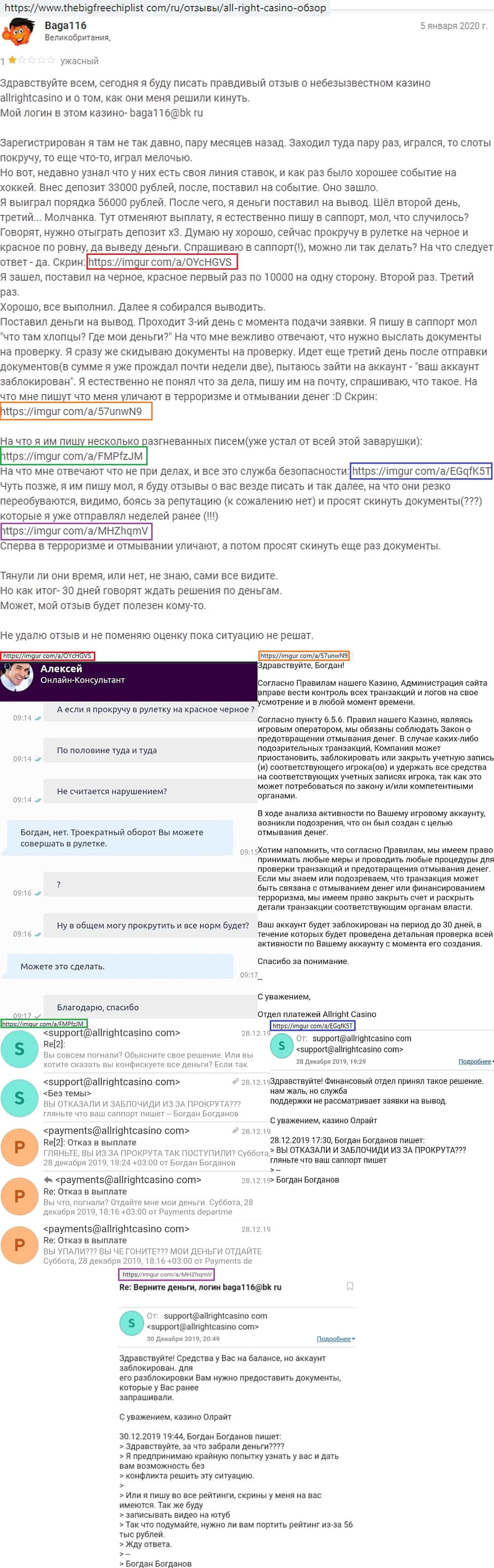 Очень подробную жалобу оставил один из обманутых воришками All-Right-Casino веб-сервису зебигфричиплист ком. После нескольких удачных ставок шулера All-Right-Casino обвинили своего игрока в терроризме и мошенничестве и отказали в выплате. Более месяца отчаявшийся пользователь не может добиться правды.