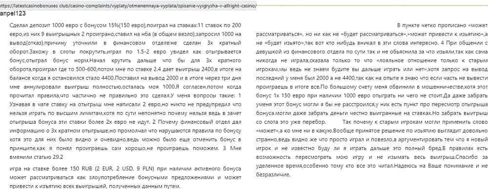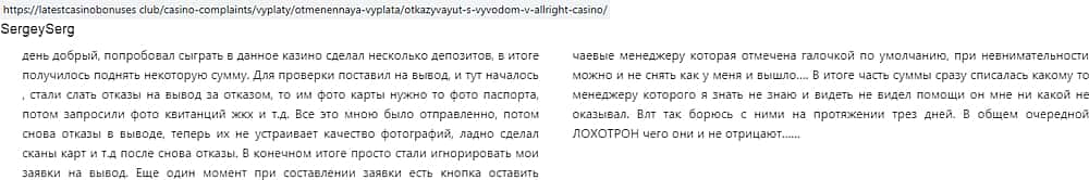 Получив бонус в виде бесплатных спинов, один из юзеров смог его отыграть, как и прописано в правилах. Вот только в планы интернет-лоховодов не входила подобная ситуация. Афеисты Алл Райт Казино сразу же начали разводить игрока на пополнение счета, якобы для выведения средств, а в итоге он не получил бы никаких денег вовсе.