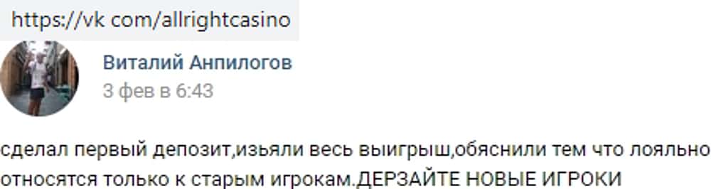 В официальной группе проходимцев All-Right-Casino, один из бывших игроков этого недосервиса рассказал, что после заведения депозита шулера отказали ему выплачивать выигрыш. Объяснили это аферисты All-Right-Casino тем, что существуют старые и новые игроки. Какое-то довольно странное обоснование для отъема денег.