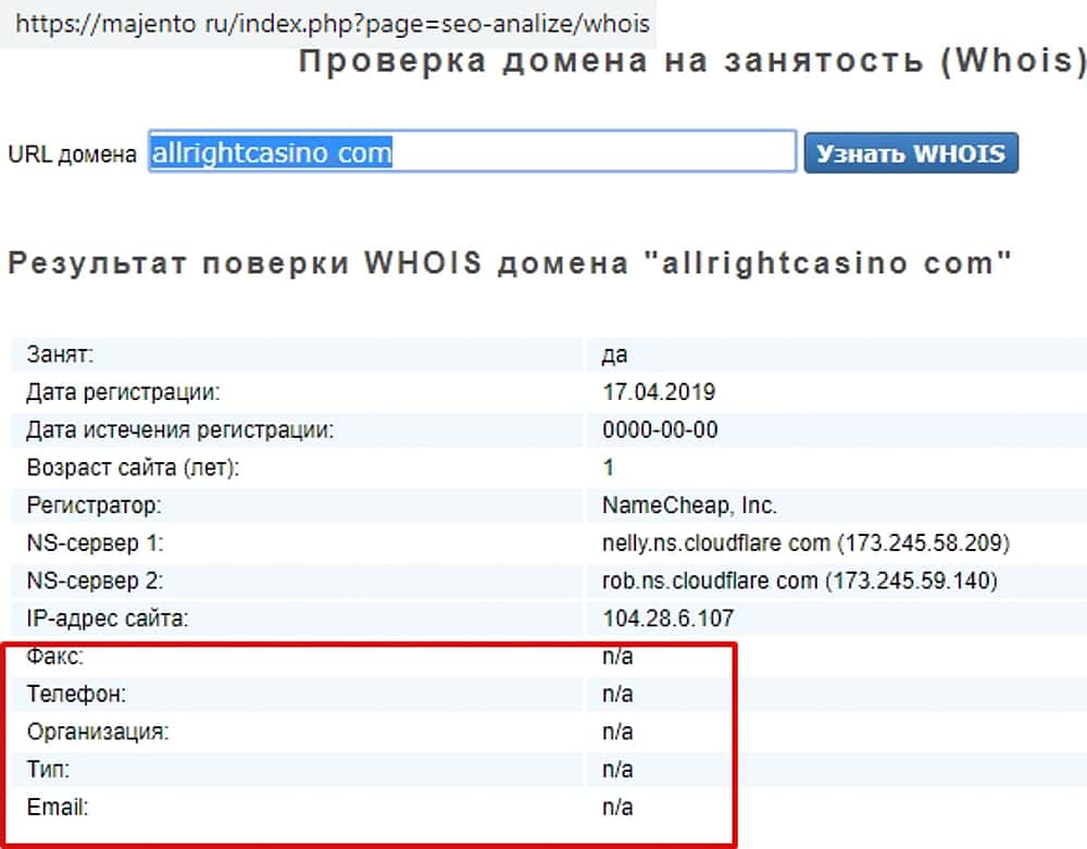 Шарашка All-Right-Casino имеет очень много доменов и зеркал сайтов, поскольку по словам самих же авантюристов, их регулярно блокирует РосКомНадзор. Сайты шарлатанов прикрепляют к доменам-однодневкам, принадлежащие и зарегистрированные непонятно на кого и кем, поскольку мошенническая деятельность их противозаконна.