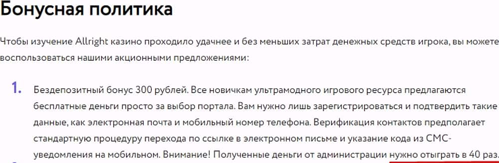 Шайка мошенников All-Right-Casino предлагают новичкам в качестве некоего подарка бездепозитный бонус в размере 300 рублей, который нужно отыграть в 40 раз, а это 12000! Сомнительно, что это реально выполнимое условие, но песочница All-Right-Casino в этом случае может "помочь", чтобы для вывода запросить с вас настоящий депозит.