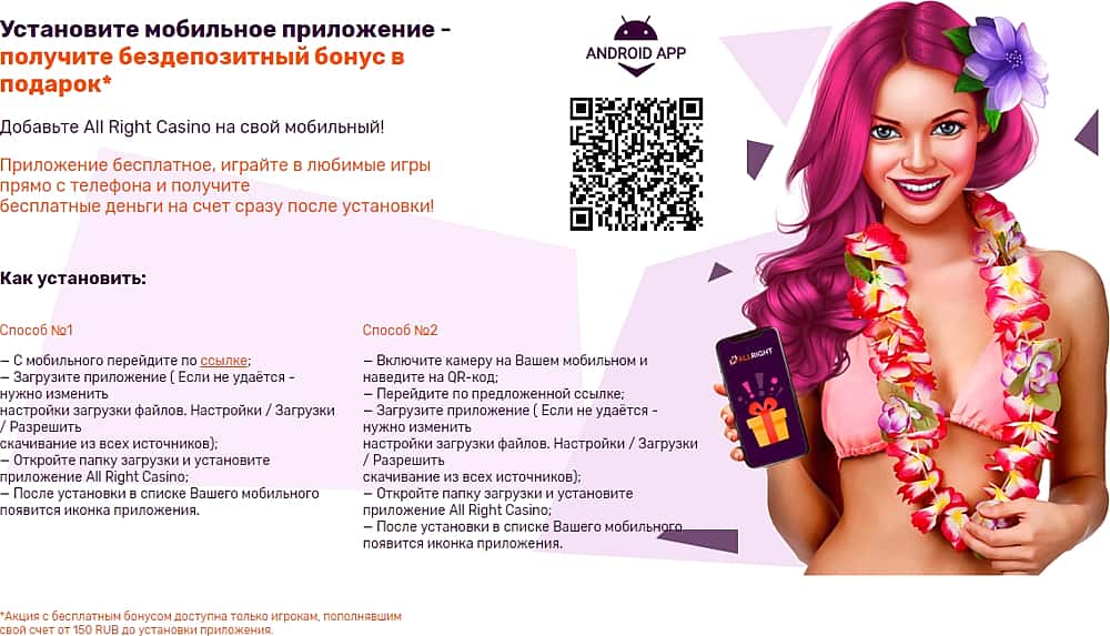 Для того, чтобы расширить аудиторию игроманов, а также позволить им дольше залипать в имитацию честной игры, воришки Алл Райт Казино слепили мобильное приложение для смартфонов. Игроков завлекают его скачивать обещая бездепозитный бонус, но сноска внизу лишний раз подтверждает, что бесплатный сыр только в мышеловке.