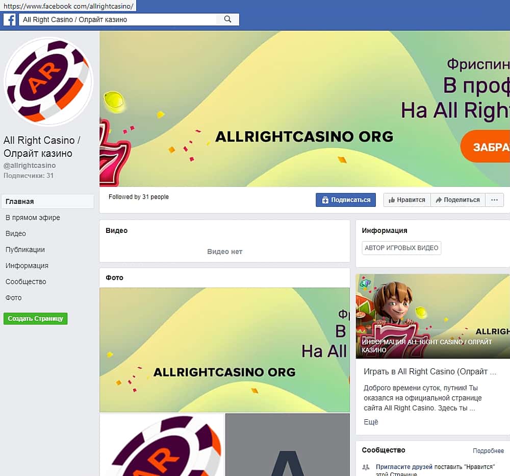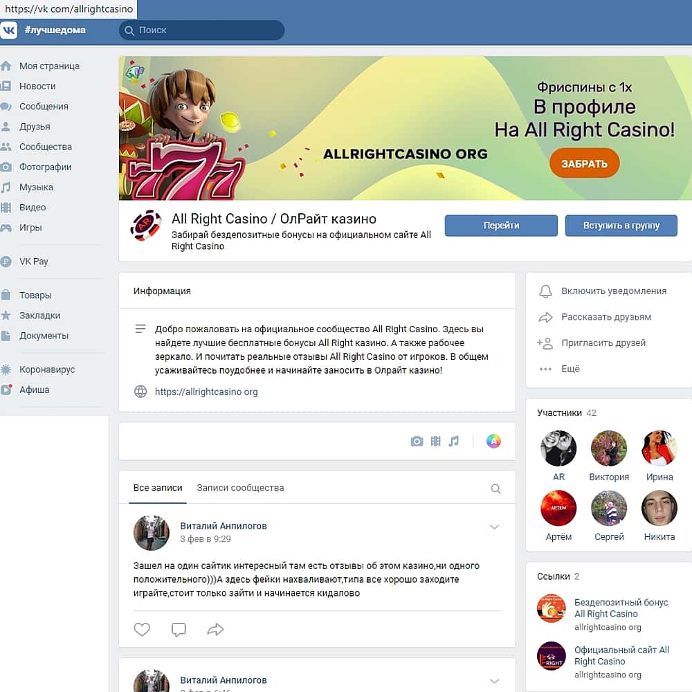 В известной российской соцсети vk com, авантюрная команда Алл Райт Казино тоже обзавелась пабликом. Подписчиков у этой недоделанной рекламной странички как кот наплакал. Позитивные комментарии написаны все теми же несколькими псевдопоклонниками в хвалебном ключе без всяких фактов, просто сплошная вода.