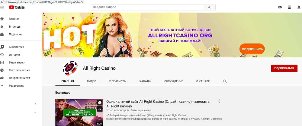Контент канала жульнической своры Алл Райт Казино на популярном видеохостинге youtube com довольно скудный для размаха этой аферы. Представлен всего один рекламный развод-ролик, у которого из более чем 1000 просмотров всего три положительные оценки. Подписчиков убогий канал шарашки Алл Райт Казино не имеет ни одного.