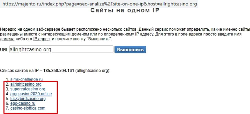 Раскручиваемый в официальных группах соцсетей посадочный развод-лендинг allrightcasino org, который заблокировать как просто информационный ресурс нельзя, как оказалось соседствует на одном IP не только со своими "коллегами": Slottica, LuckyBirdCasino, SuperCat-Casino, но и с сомнительными игротеками: Ego Casino и Argo Casino.