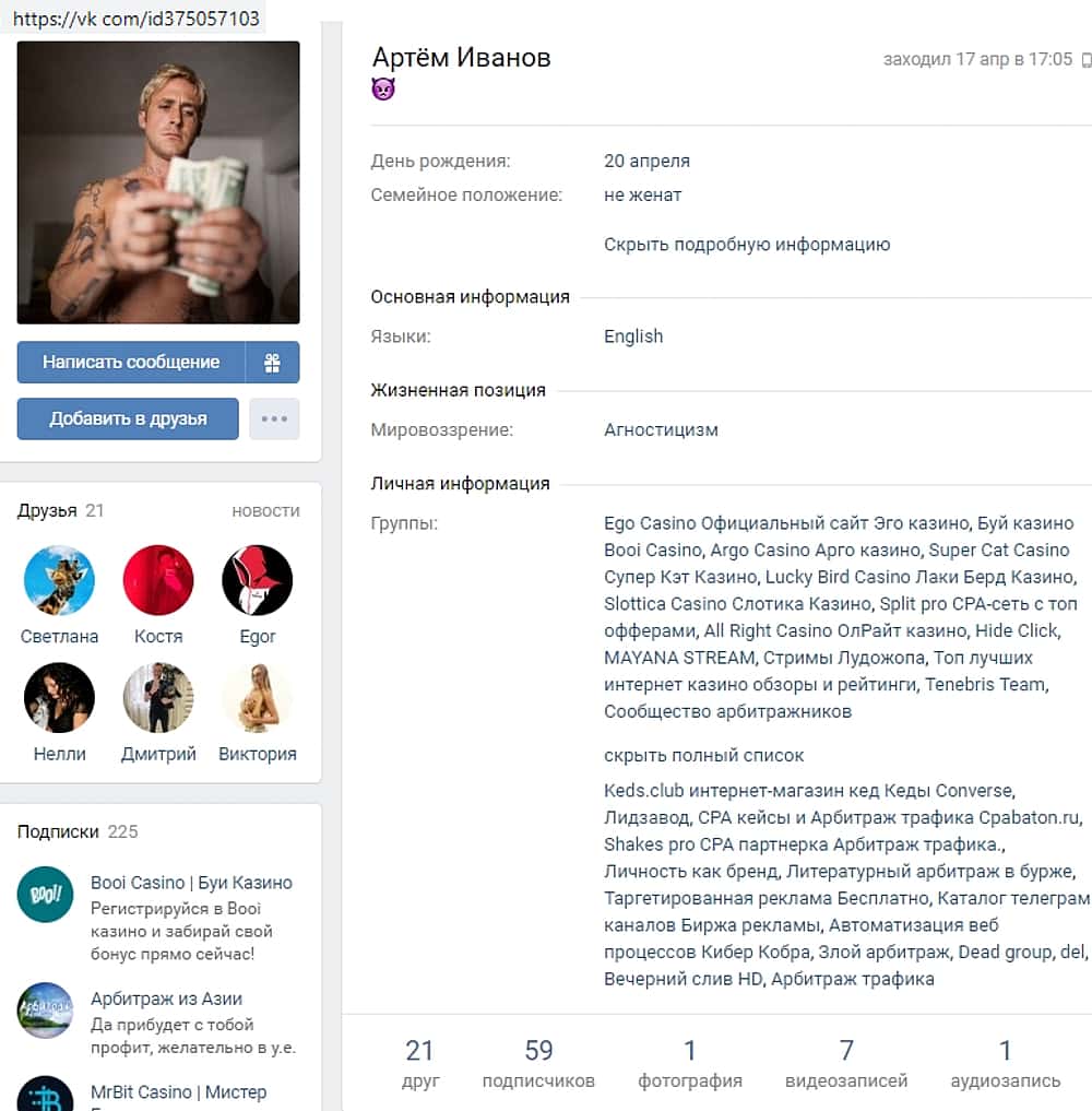 - Артем Иванов - администратор рекламных групп сомнительных игроклубов.