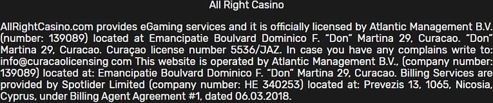 На своем подвальном сайте, жалкие аферисты All-Right-Casino указали номер якобы существующей лицензии, которую они получили от оффшорного лицензиата C.I.L. Curacao Interactive Licensing N.V. Сайта у данной организации нет, но аферюги All-Right-Casino предоставили их электронную почту для проверки.